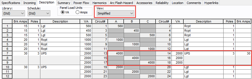 Agora você pode inserir valores de carga nas colunas VA e Ampères do disjuntor na exibição Simplificado e o valor de carga inserido é automaticamente adicionado à fase apropriada.