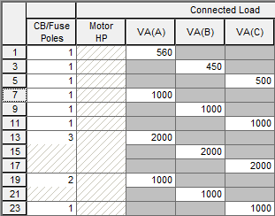 As fases e o número de polos do circuito afetam o comportamento da linha do quadro. Abaixo está a imagem de um quadro trifásico com uma mistura de polos. Quando a caixa de seleção Disposição com fase fixa está marcada, as fases aparecem diagonalmente para cada linha, com a fase A na primeira linha da primeira coluna, a fase B na segunda linha da segunda coluna e a fase C na terceira linha da terceira coluna. Esse padrão de fase se repete em toda a planilha.