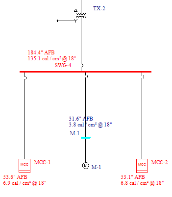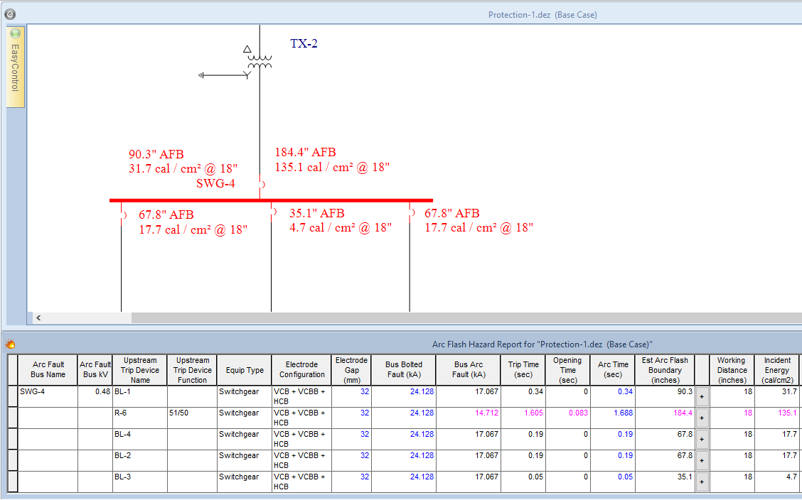 6. Clique em  Arco Eléctrico. Os resultados de energia incidente aparecem no unifilar do coordenograma.