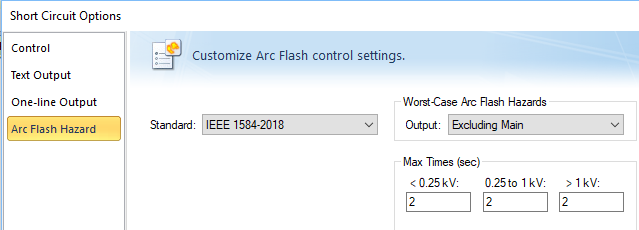Nota: A EasyPower recomenda fortemente que os cálculos de arco elétrico sejam realizados utilizando os tempos de eliminação reais dos dispositivos de proteção. Isso é automático se você possui o recurso Protection & Coordination™ do EasyPower e inseriu os dados do dispositivo de proteção para cada dispositivo.