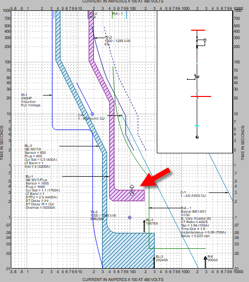 7. Arraste a unidade de curta-duração da curva SST do disjuntor roxo BL-1 (o da direita) para cima e para baixo.