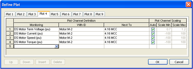 Definir Plotagens. - Na plotagem Plot 4 podem ser vistas a tensão, a corrente, a velocidade e o torque do motor M-2. Selecione os valores a serem plotados escolhendo as variáveis sob Monitoração, Com Identificação e Próximo a, como mostrado na figura abaixo.