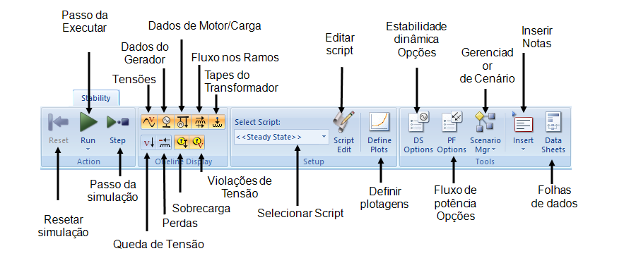 - Para escrever um novo script, assegure-se que o unifilar esteja selecionado, e a seguir, na guia Estabilidade, clique em