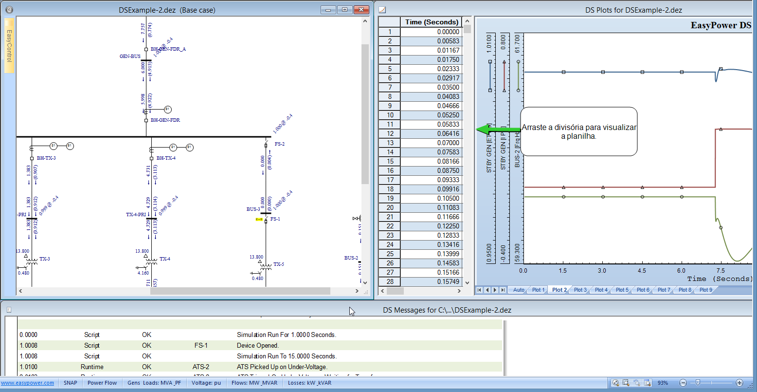 Se você possui o recurso de coordenação Protection & Coordination™, a Estabilidade dinâmica também pode simular a resposta dos dispositivos de proteção. Você poderá simular o dropout de contatores para quedas de tensão acentuadas ou até o chaveamento de CTA para energia de emergência. Lembre-se de entrar primeiro com os dados no módulo de Edição da Base de Dados na guia Estabilidade, na caixa de diálogo de cada equipamento. Faça uso dos scripts para simular a sequência dos eventos e utilize a ferramenta Definir Plotagem para monitorar o valor das grandezas.