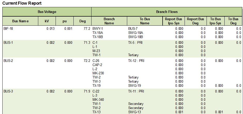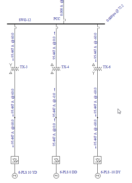 O motor da barra “SWG-12” representa um acionamento de 18 pulsos. Cada motor injeta um espectro harmônico. (O espectro harmônico injetado é especificado para cada motor na caixa de diálogo na base de dados Dados do Motor. A biblioteca de dispositivos do EasyPower também contém espectros harmônicos típicos que podem ser importados.) As correntes e tensões são baseadas em todas as injeções de quinta harmônica das fontes no sistema. O harmônico especificado pode ser alterado através da caixa de diálogo Opções Harmônicas. Observe que a corrente harmônica de quinta ordem cancela no transformador TX-12 devido ao cancelamento de fase. A ferramenta Fluxo com Todas as Fontes de Corrente determina o fluxo numa rede com todas as fontes contribuindo.