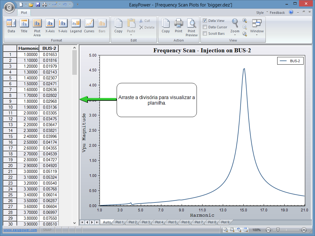 Por padrão baseia-se em uma injeção de corrente de 1,0 por unidade em BUS-2. O "scan" mostra a tensão em por-unidade em relação à frequência harmônica desta corrente injetada. A tensão em por-unidade pode ser considerada como uma impedância por-unidade uma vez que a injeção de corrente permanece 1 por-unidade.