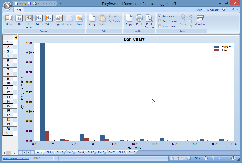 Gráfico de Barras do Espectro na guia Harmônicos. Isto abre o gráfico de barras que mostra os diferentes harmônicos presentes nas barras (de tensão) ou nos ramos (de corrente).