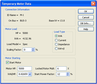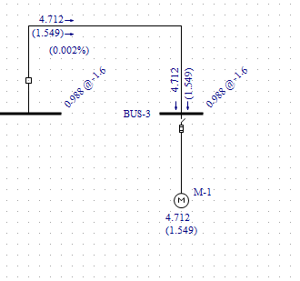 Nota: Você pode alterar o carregamento de vários motores e cargas clicando em Mudar o Fator de Escala na guia Fluxo de Potência. As alterações serão aplicadas aos motores e cargas de seu unifilar que estão selecionados em verde. Esta é uma maneira fácil e rápida de checar condições de carregamentos de pico, de baixa carga e expansões futuras e outros fatores inerentes a um sistema de potência.