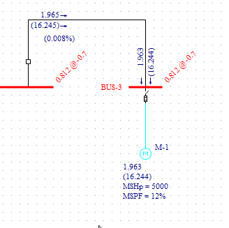 Simule o Motor. Os resultados da partida do motor são apresentadas no seu unifilar. Observe as barras que se tornam vermelhas. Suas tensões estão abaixo do "Limite de Subtensão da Barra". Este limite é pré-definido como sendo 5% de 1 pu. Isto pode ser alterado na caixa de diálogo Ferramentas> Opções de Fluxo de Potência na guia Controle. Tanto na análise de fluxo de potência como no de partida de motores, você pode identificar rapidamente os problemas pontuais de tensão simplesmente procurando pelas barras vermelhas.