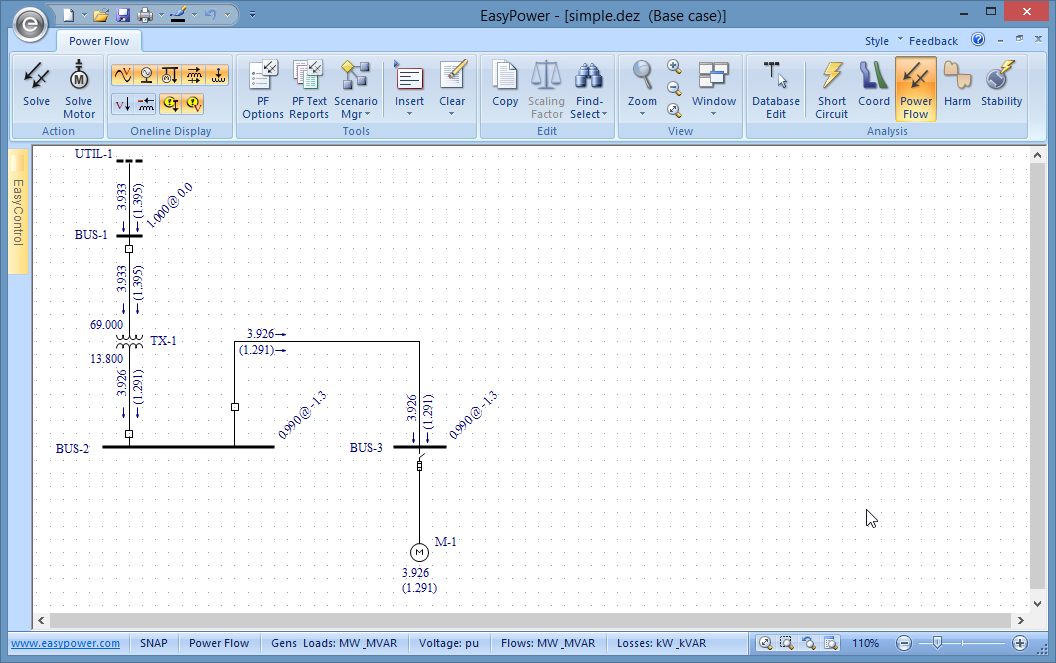 Neste tutorial, você verá como usar vários recursos de cálculo de fluxo de potência do EasyPower. O EasyPower usa o algoritmo mais robusto e preciso já desenvolvido: o Método de injeção de corrente. O programa também utiliza as mais modernas técnicas de algoritmos de esparsidade para determinar as condições de fluxo de potência de regime permanente para um sistema de potência em operação.
