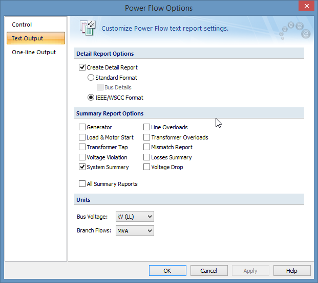 - Enquanto ainda visualizando as Opções de Fluxo de Potência, escolha Relatórios em Texto. Um caixa de diálogo similar à mostrada abaixo é exibida.