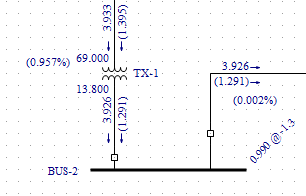 Resolver. O EasyPower exibe o cálculo de fluxo de potência desse pequeno sistema. O fluxo de megavars são mostrados dentro dos parênteses e os fluxos de megawatts não estão entre parênteses. As tensões em pu e os respectivos ângulos são apresentados ao lado de cada barra, com uma inclinaçao de quarenta e cinco graus (veja figura abaixo).