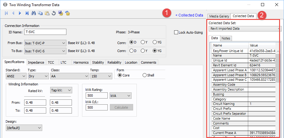 Para cada item no unifilar, você pode exibir os dados que foram importados selecionando o painel Dados coletados na caixa de diálogo de dados do equipamento e, em seguida, clicando na guia Dados coletados.