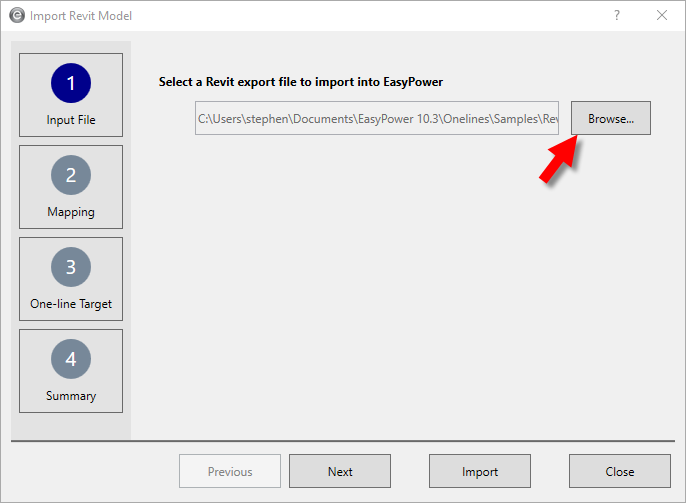 Depois que um desenhista elétrico do Revit cria um arquivo de exportação a partir do projeto do Revit, você pode importar esse arquivo para o EasyPower a fim de criar automaticamente um modelo de unifilar. Para importar o arquivo do Revit, faça o seguinte: