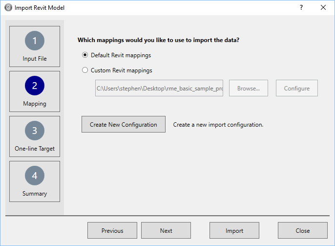 - Clique em Mapeamento. Para esse exemplo, usaremos os Mapeamentos padrão do Revit, mas observe que você também pode criar mapeamentos customizados do Revit e novos arquivos de configuração aqui. Isso oferece controle adicional sobre como os dados são importados e permite criar arquivos de configuração que podem ser reutilizados em importações futuras.