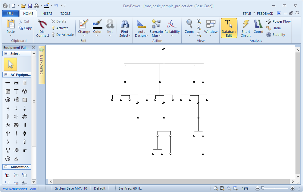 Nesse ponto, você pode realizar alterações de projeto e análises no unifilar. Isso inclui a execução de projeto automatizado, análise de curto-circuito e arco elétrico e o cálculo da queda de tensão no fluxo de potência. Para obter informações sobre esses recursos, consulte os tutoriais adicionais. Observe que talvez você precise adicionar outros componentes (como uma fonte de alimentação da concessionária) e inserir dados adicionais (como impedâncias de transformador) para conseguir realizar a análise.