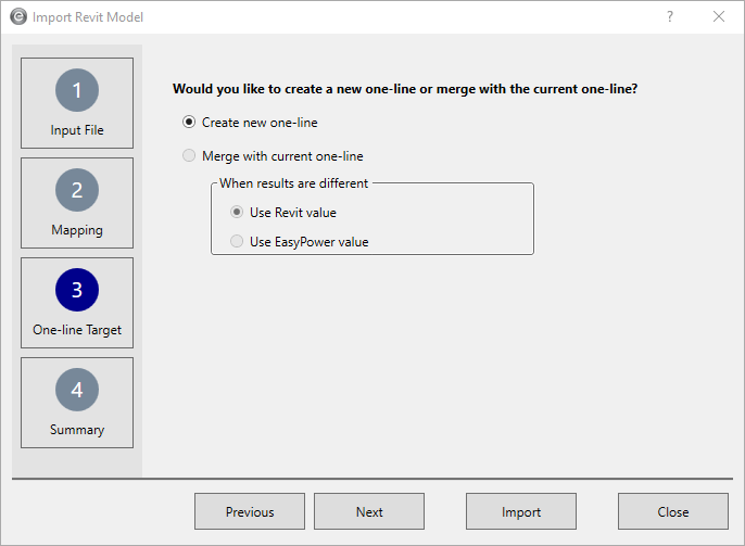 - Clique em Unifilar de destino. Para esse exemplo, selecionaremos Criar novo unifilar, mas observe que você também pode mesclar os dados de importação com um unifilar atual.
