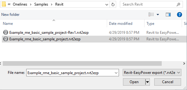 - Vá até C:\Users\{username}\Documents\EasyPower 10.6\Onelines\Samples\Revit, selecione o arquivo Example_rme_basic_sample_project.rvt2ezp e clique em Abrir. Esse é um arquivo de amostra que representa um arquivo que você pode receber de um desenhista elétrico do Revit.