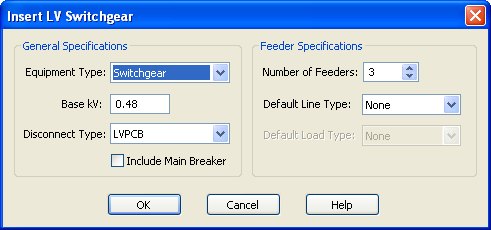 Centro de Distribuição de Cargas de BT. O cursor muda para o símbolo de um centro de distribuição de cargas. Clique no unifilar para posicionar o centro de distribuição de cargas. A caixa de diálogo Inserir Centro de Distribuição de Cargas de BT aparece. Isto habilita você a especificar o tipo de barra, dispositivos de proteção, alimentadores e cargas e o número de circuitos alimentadores.