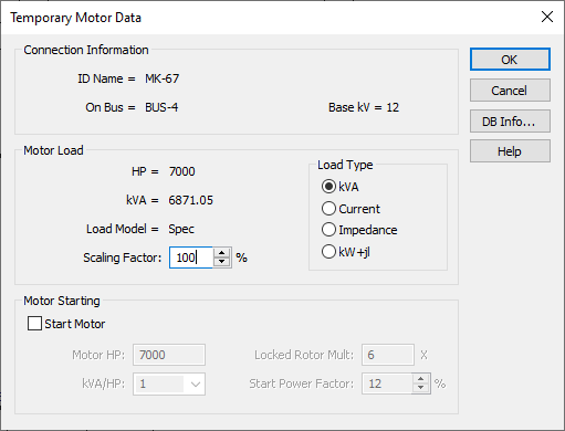 Por exemplo, considere um motor onde existe uma carga motriz total de 7000 HP com fator de escala 100 percento. O caso base de fluxo de potência indica uma tensão de 0.993 pu com 5.676 MW e 1.866 MVAr fluindo para o motor de 7000 HP. Isto também pode ser mostrado como sendo 5.975 MVA com fator de potência de 0.95 alterando-se a forma de exibição dos resultados no unifilar.