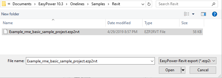- Selecione o arquivo exportado do EasyPower e clique em Abrir. Para as finalidades deste tutorial, é possível usar o arquivo Example_rme_basic_sample_project.ezp2rvt guardado em C:\Users\{username}\Documents\EasyPower 11.0\Onelines\Samples\Revit.