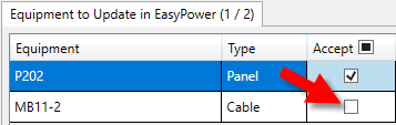 Observe que pode haver várias guias na parte superior da caixa de diálogo para o equipamento atualizar, adicionar ou excluir. Neste exemplo, há apenas uma: Equipamento a atualizar no EasyPower. Ao mesclar seus próprios arquivos, certifique-se de observar as guias adicionais.