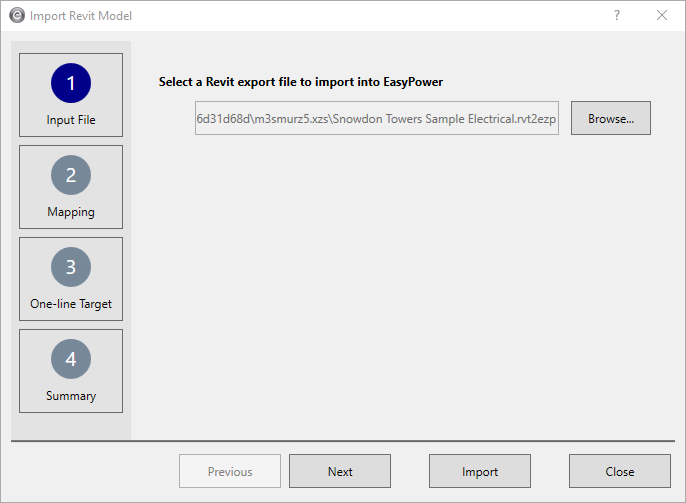 Com o Arquivo de entrada selecionado, clique em Procurar, procure a pasta C:\Users\{username}\Documents\EasyPower 25.0\Onelines\Samples\Revit e selecione o arquivo Snowdon Towers Sample Electrical-Rev1.rvt2ezp. Esse arquivo inclui alterações que foram feitas no projeto do Revit. Clique em Abrir.