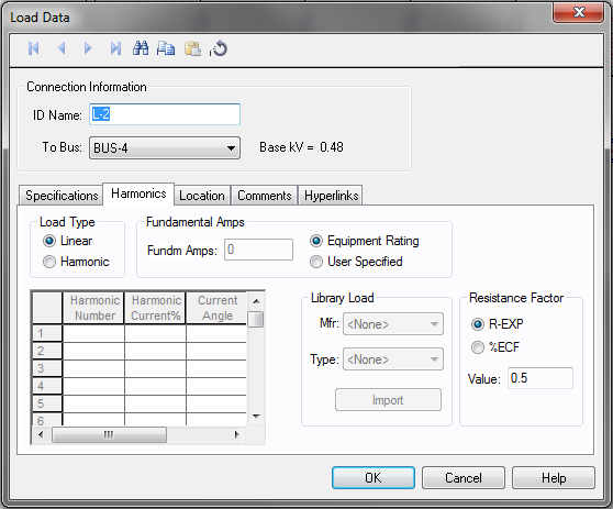 Las cargas con contenido armónico se pueden especificar como cargas armónicas. Para especificar cualquier carga o motor como de contenido armónico, es necesario estar en el modo Edita Base de datos. Los cuadros de diálogo de datos de equipo, tal como el de Datos de Carga incluyen una pestaña Armónicos.