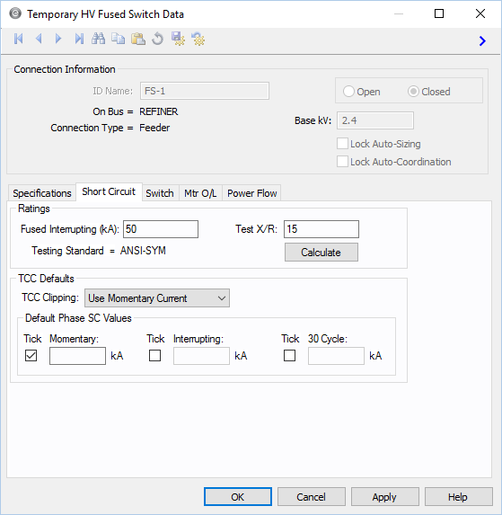 Figura 1: Pestaña de Cortocircuito del Cuadro de Dialogo de Datos Temporales de Interruptor con Fusible (ANSI)