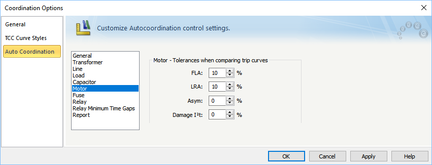 Establece la distancia mínima entre la curva de disparo del dispositivo de protección y la curva de daño térmico I^2T del motor. El rango es de -50 % a 50 %. Nota: Al coordinar los dispositivos de protección en baja tensión, EasyPower asume el tamaño máximo del motor aguas abajo es 250 HP. |
