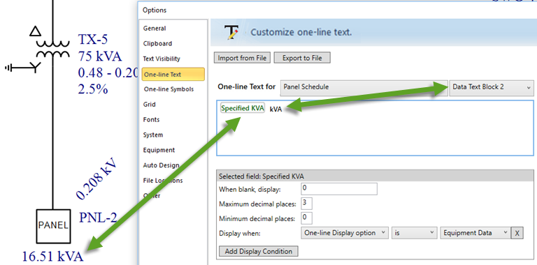 Puede personalizar el texto que aparece en el diagrama-unifilar. Esta personalización se puede exportar y luego importar a otros archivos de diagramas-unifilares. Puede formatear la apariencia del texto para los elementos individuales del equipo y puede especificar las condiciones de visualización que controlan cuando aparece el texto.