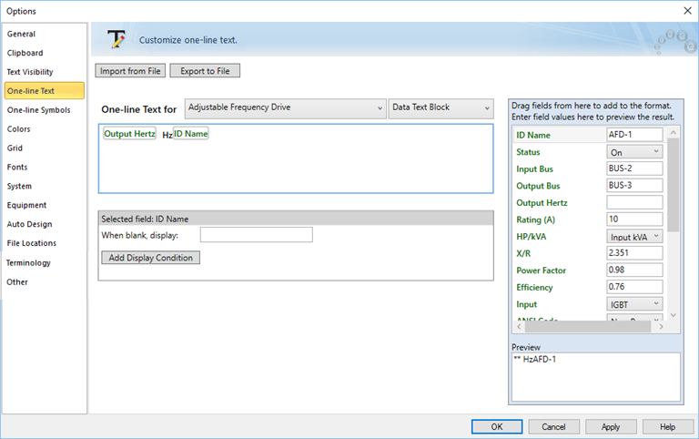 11. Para agregar condiciones de visualización, seleccione el campo o texto para el que desea crear una condición de visualización, haga clic en Añadir Condición de Visualización y luego seleccione las opciones de visualización. Esto controla si el campo o el texto aparecen en el diagrama-unifilar en función de las condiciones seleccionadas. Ver Para Agregar Condiciones de Visualización para más información.